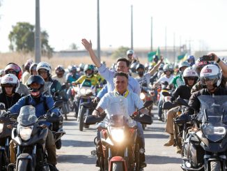 Com João Roma na garupa, o presidente Bolsonaro seguiu em motociata para a vistoria das obras do rodoanel da cidade, que vai interligar quatro rodovias federais.